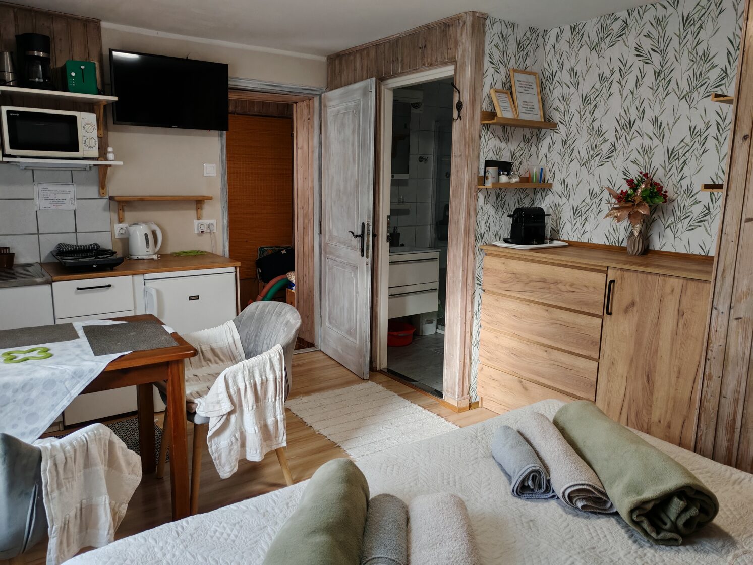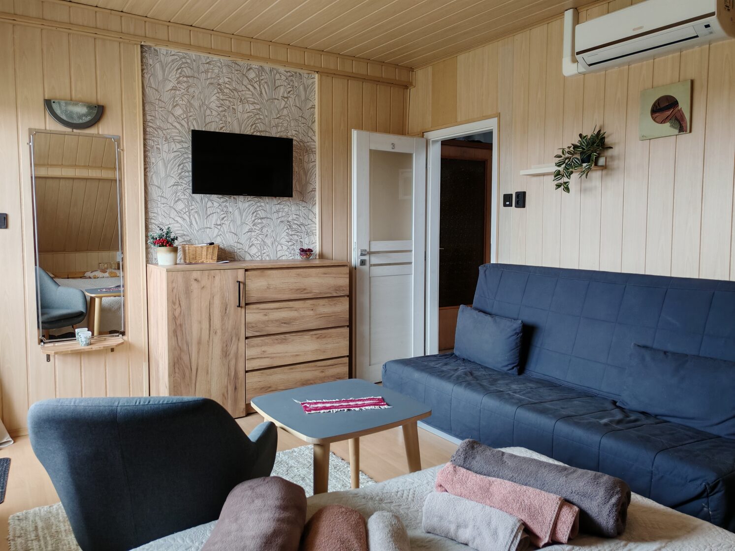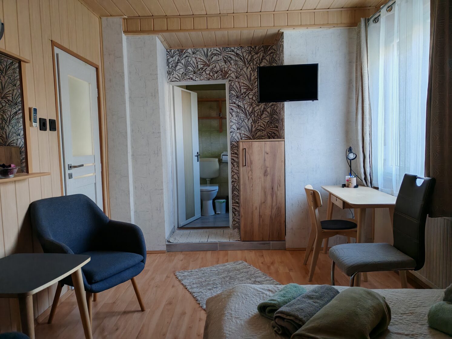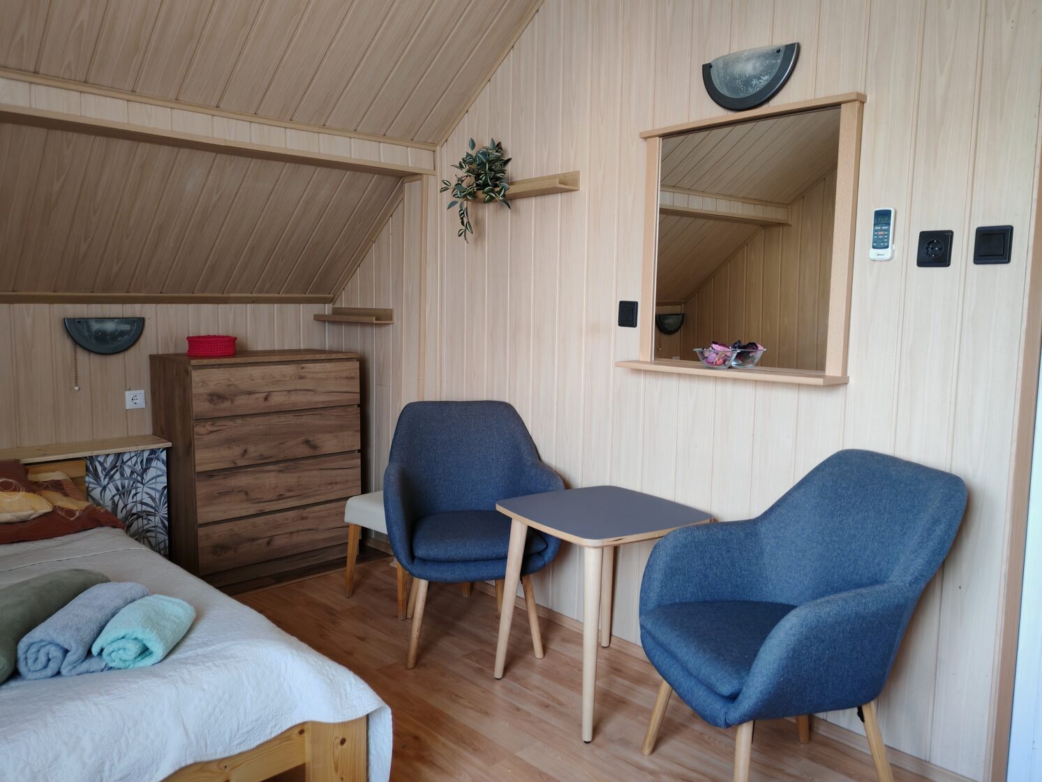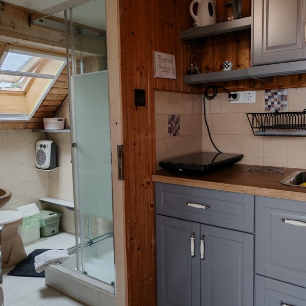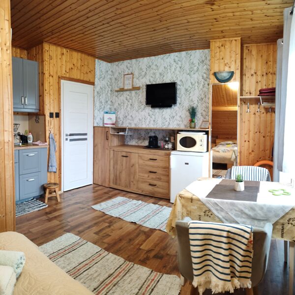 Studiové apartmány. Standardní pokoje (20 m2) s jedním otevřeným prostorem. Všechny se stejným vybavením. Apartmán pro 4 osoby (60 m2) se nachází v prvním patře, se 2 koupelnami a 2 ložnicemi. Ideální pro páry (viz půdorys).